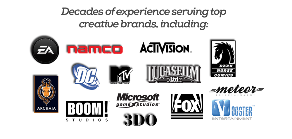 With over 20 years of experience producing and developing original content, intellectual properties, and game design for some of the top entertainment studios and publishers in the world, we sorta know what we're doing. Just ask Electronic Arts, Namco Bandai, Activision, LucasFilm, Dark Horse, DC Comics, MTV, Archaia Entertainment, Boom! Studios, Meteor Entertainment, Microsoft Games, Fox Entertainment Group, The 3DO Company, and Vogster Entertainment.