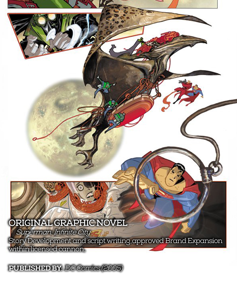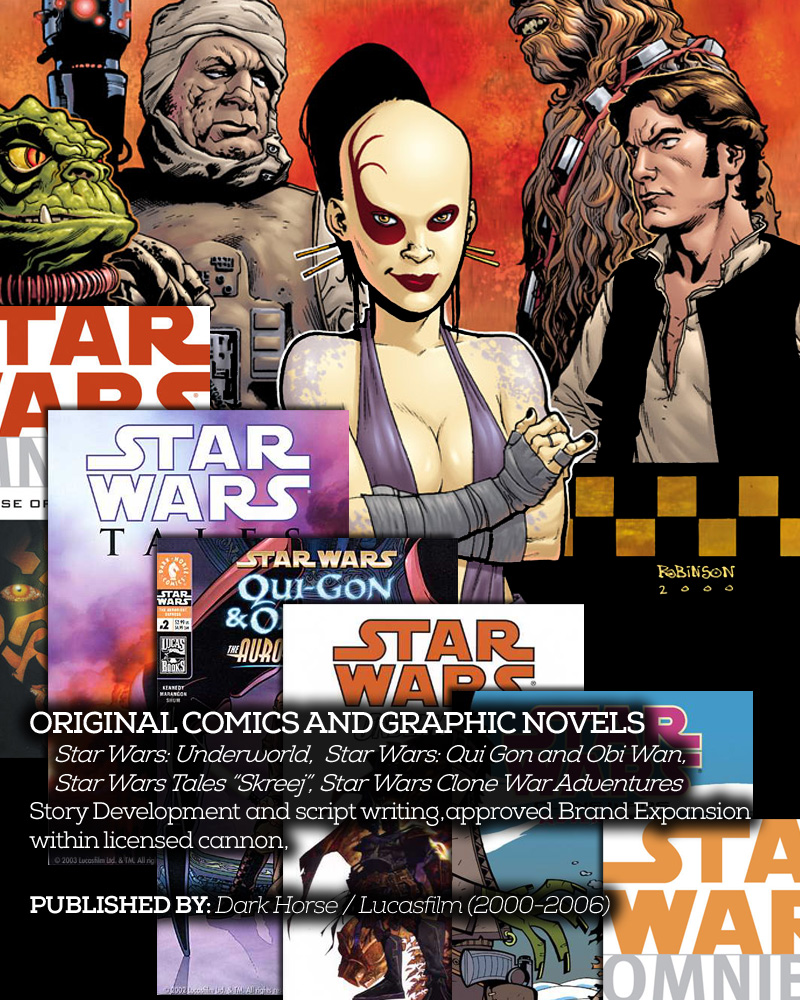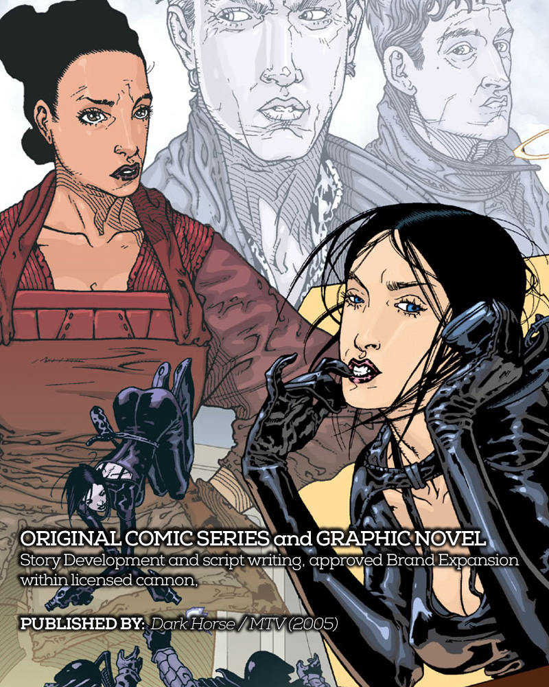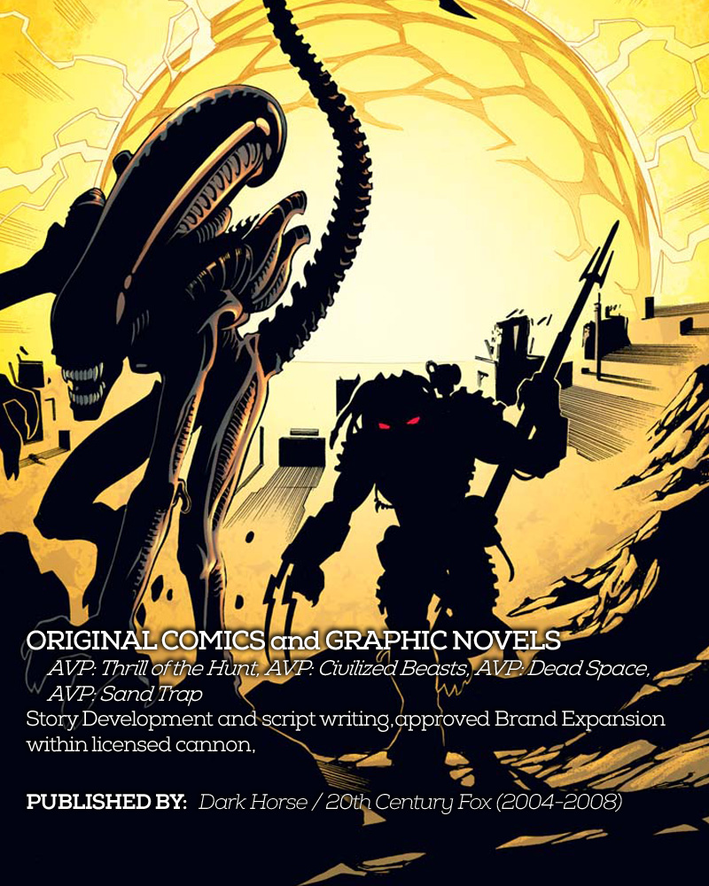 We've developed original properties and story material for dozens upon dozens of video games and graphic novels, including authorized and published expansions to popular licensed properties such as Star Wars, Alien vs Predator, Superman, Batgirl, and Aeon Flux.
